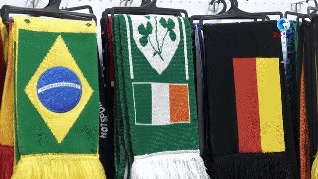 满载着喇叭、旗帜和足球等商品的集装箱卡车