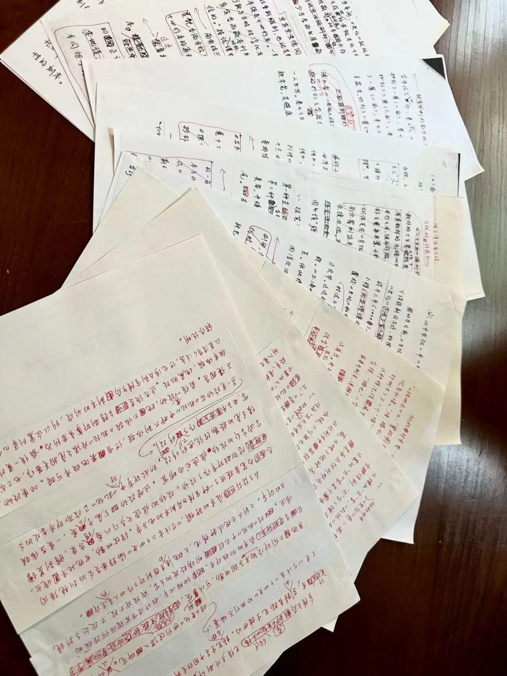 比A4还小的16开纸上,空隙处塞满了红色的黑色的小字。底稿写不下,在旁边贴纸条,还不够,就在纸条上贴纸条。最多一页贴了3000字。内容全是手写,怕打字员打错,每个字都一笔一画。