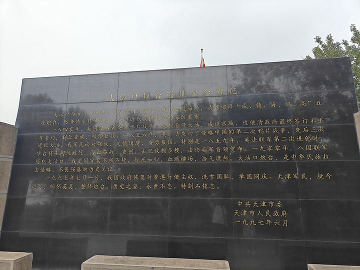 步行回馆的路上,我再次仔细端详那面黑色的大沽口炮台遗址纪念碑,注意到成碑年份的特殊性:1997年。绕到碑的后方,我不禁朗声读起铭文:“一九九七年七月一日,我国政府恢复对香港行使主权,洗雪国耻,举国同庆。天津军民,抚今追昔,缅怀英灵,整修炮台。历史之鉴,永世不忘。特刻石铭志。”