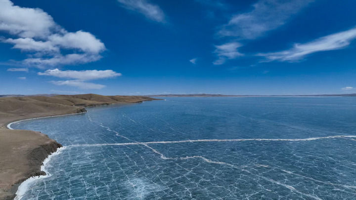 3月10日在青海省果洛藏族自治州玛多县境内拍摄的扎陵湖一角。初春时节,黄河源地区冰雪渐融。新华每日电讯记者张龙摄