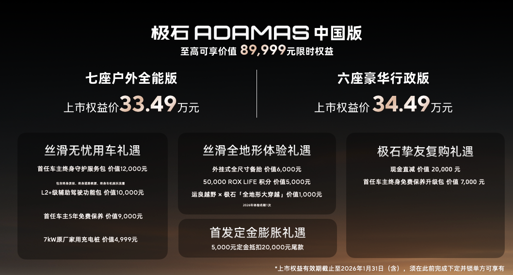 2026年1月31日前下订并锁单极石ADAMAS中国版,即可享受“首发定金膨胀礼遇”,5,000元定金直接抵扣20,000元尾款,并可叠加价值35,999元“丝滑用车无忧礼遇”、价值12,000元“丝滑全地形体验礼遇”。