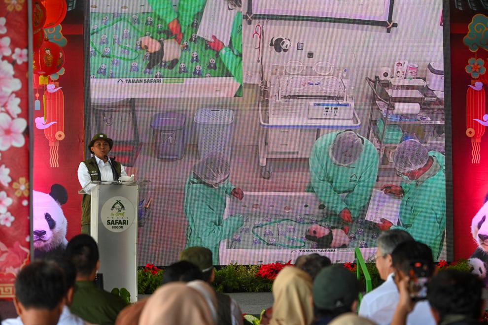 1月6日,在印度尼西亚西爪哇省茂物县的野生动物园,印尼林业部长拉贾·朱利·安东尼向观众介绍大熊猫幼仔“里奥”。