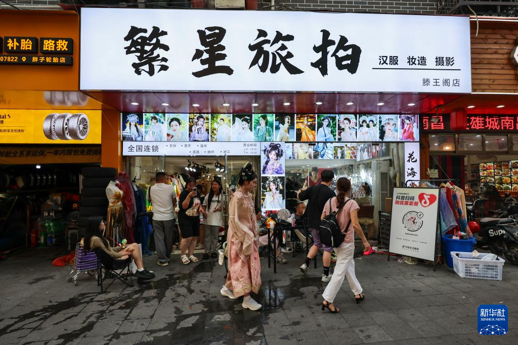 7月7日,傍晚时分,江西南昌滕王阁景区附近的一家旅拍店仍然客流不减。