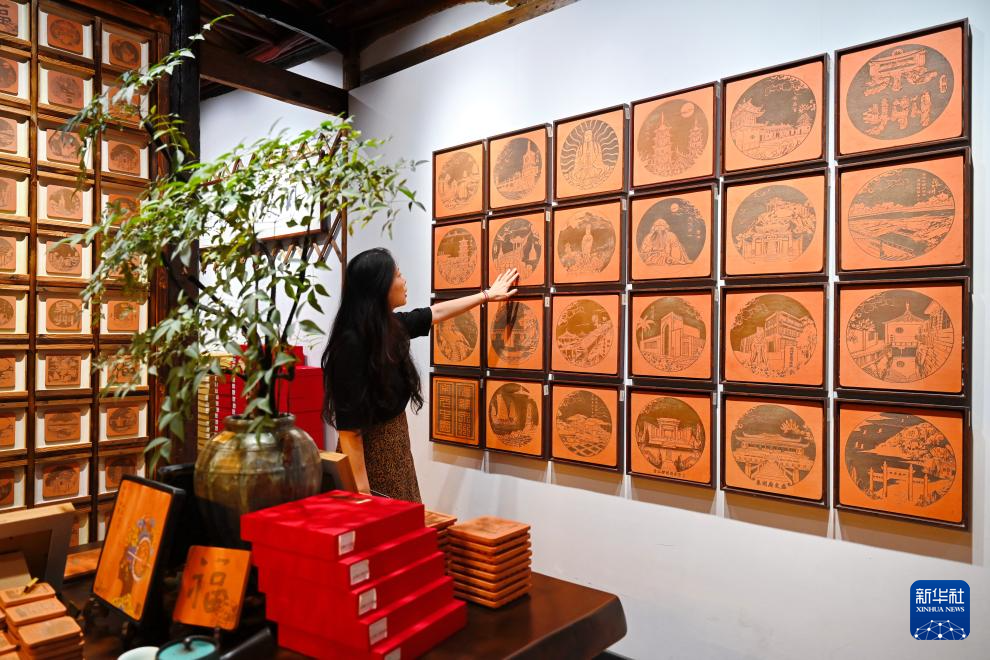 8月19日,在福建晋江梧林村,一家工艺品店经营者在介绍闽南红砖雕艺术品。