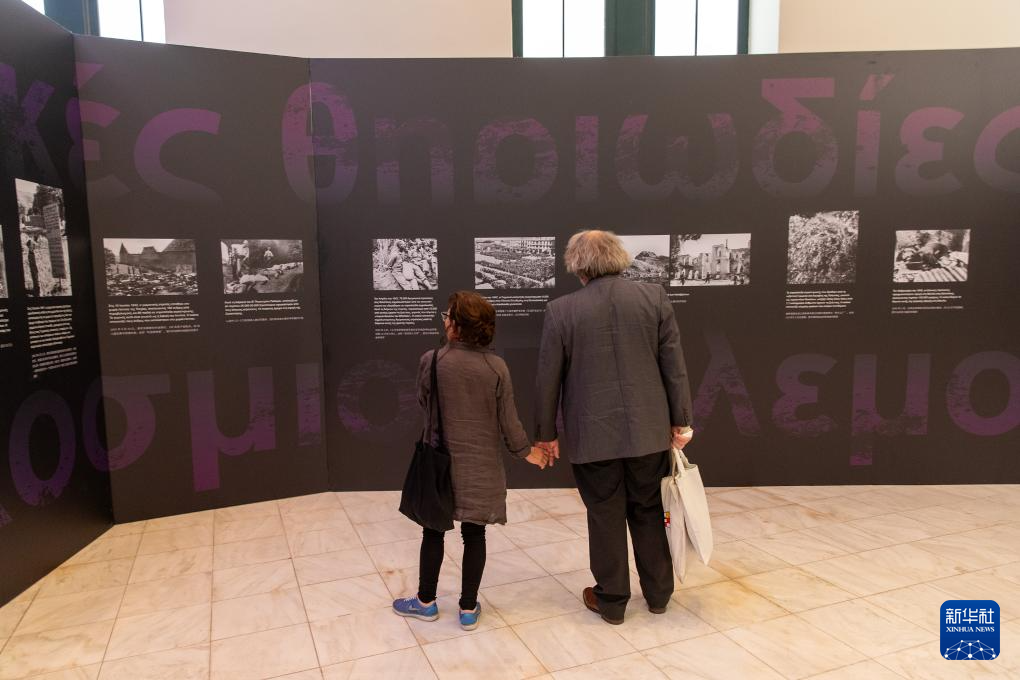 9月25日,在希腊雅典,观众在“世界记忆 和平愿景——城市记忆下的和平发展之路”展览活动上观看照片。新华社发(马里奥斯·罗洛斯摄)
