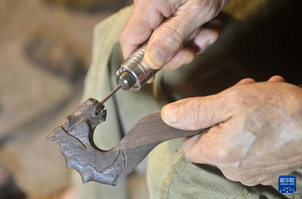 10月10日,黄一格在家中雕刻一把马骨胡的琴头。