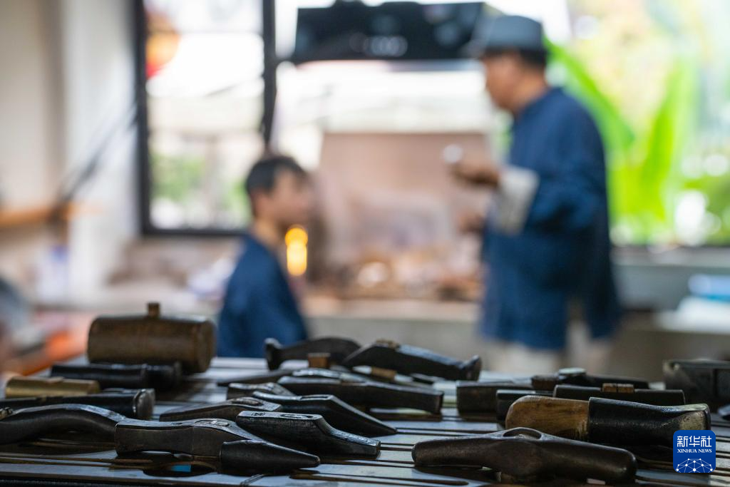 10月25日,在昆明乌铜走银传习馆內,匠人在捶打铜片。