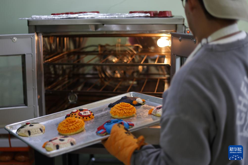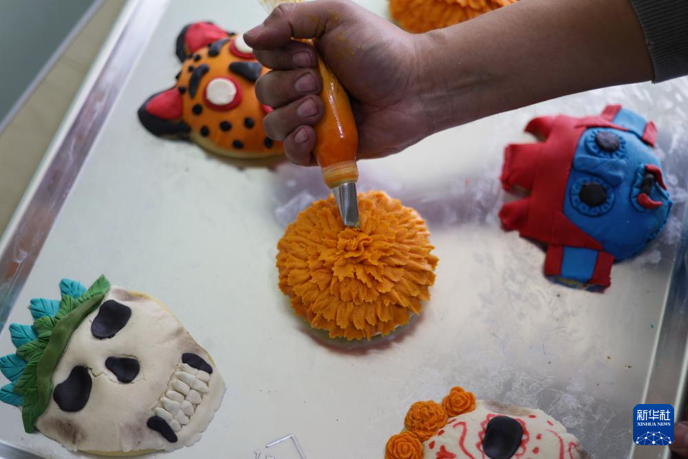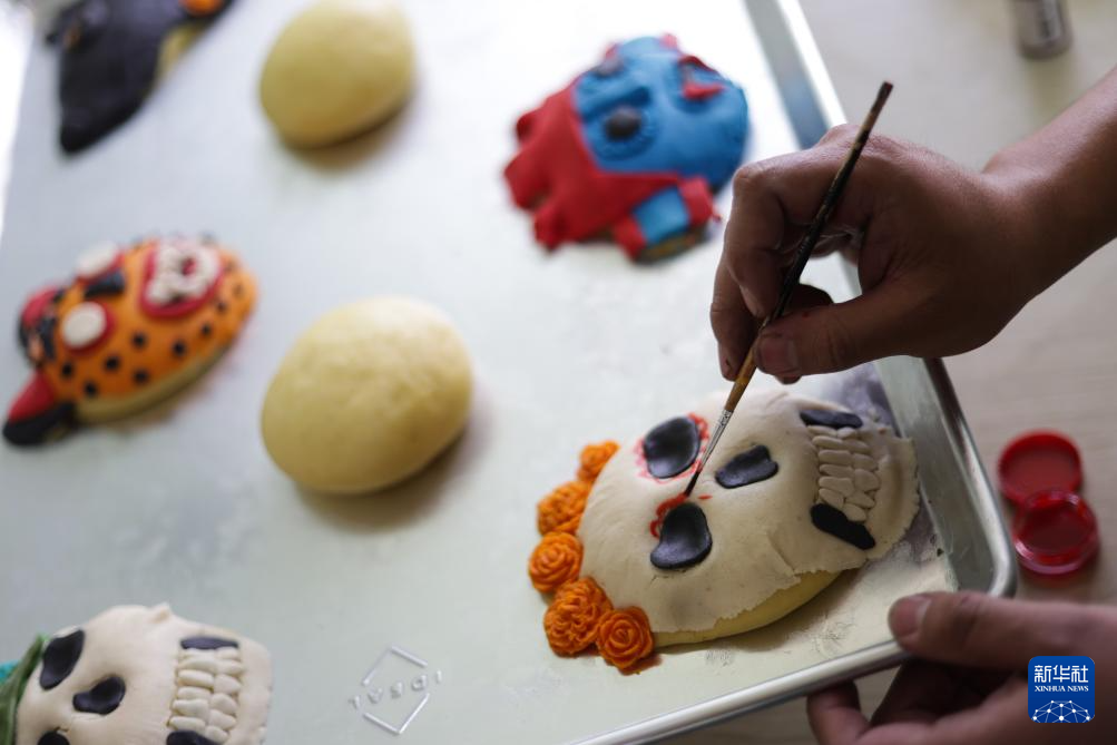 10月27日,在墨西哥首都墨西哥城的一家面包房,面包师制作“亡灵面包”。