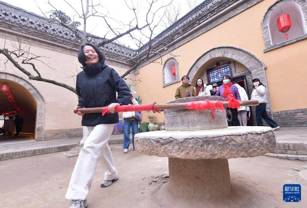 12月21日,游客在河南省三门峡市陕州区张汴乡北营村地坑院体验推石磨。