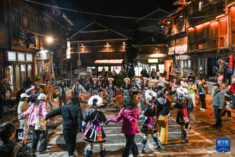 在贵州省黎平县肇兴侗寨,游客与村民在一起跳舞(12月19日摄)。