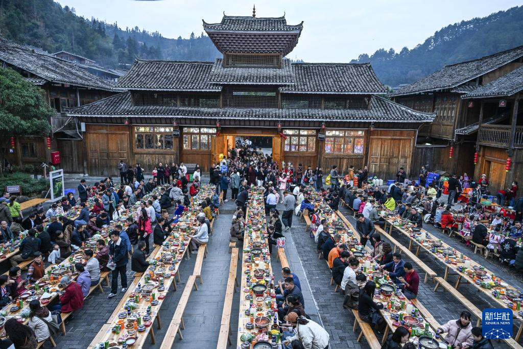 在贵州省黎平县肇兴侗寨,侗族同胞与来宾在侗年活动中共享长桌宴(12月20日摄)。