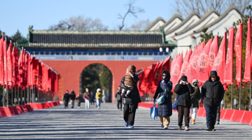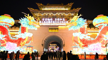 1月4日,游人在西安城墙上观赏“长安灯会”的巨型花灯。