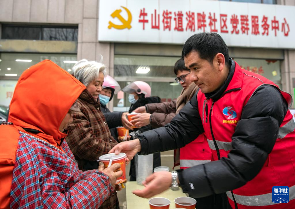 1月26日,在江苏省扬州市徐凝门街社区,志愿者为外卖员送上腊八粥。