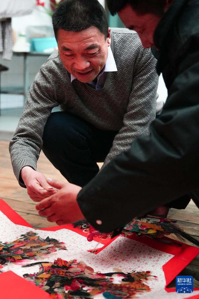 1月25日,周邦辉(左)与徒弟刘成玉在位于青海省西宁市大通回族土族自治县东柳村的家中整理演出需要的皮影。