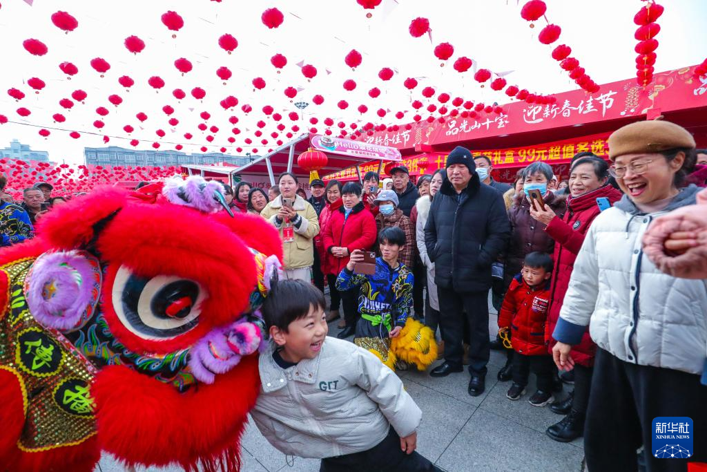 2月3日,在河南省信阳市光山县司马光广场年货市场,市民与舞狮表演艺人互动。