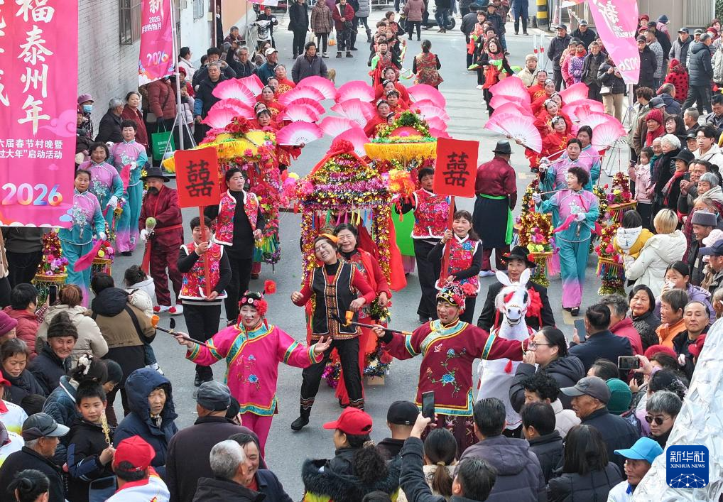 2月2日,在江苏省连云港市赣榆区墩尚镇,人们进行民俗“踩街”表演。