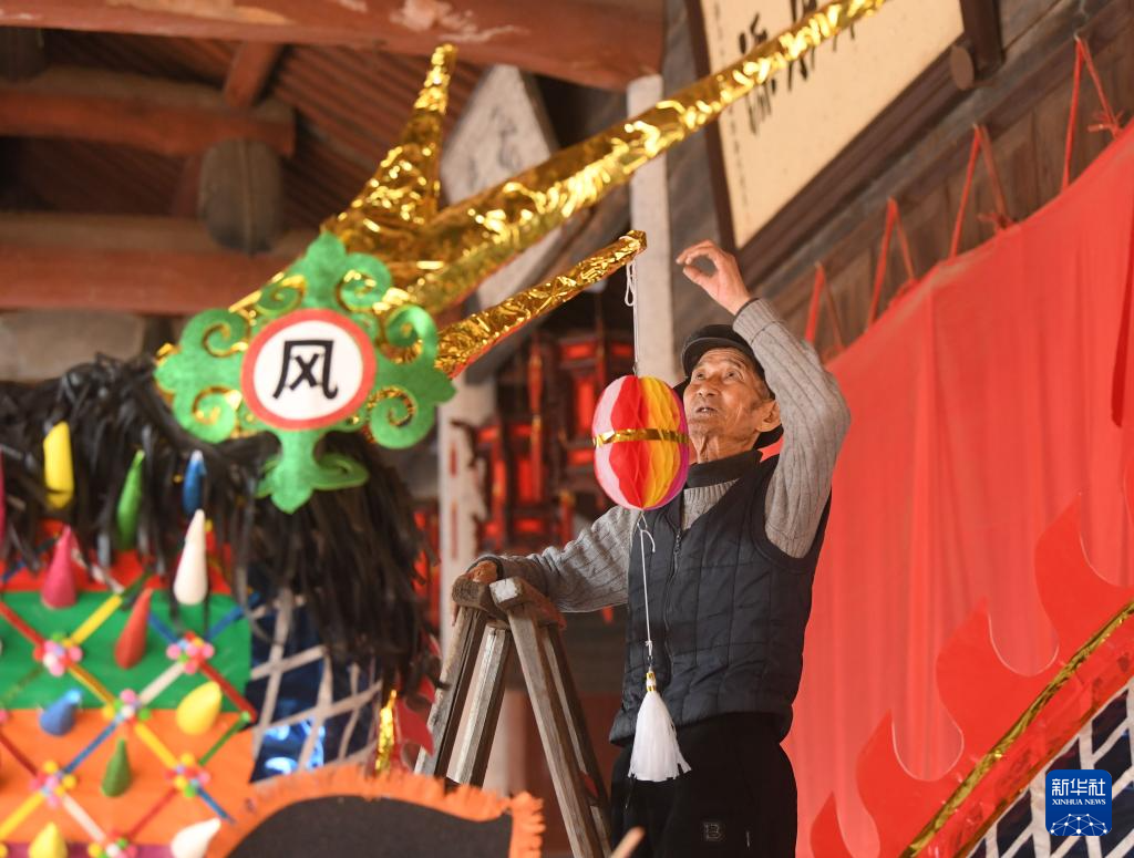 2月4日,在安华镇丰江周村的宗祠,村民在龙头上挂装饰。