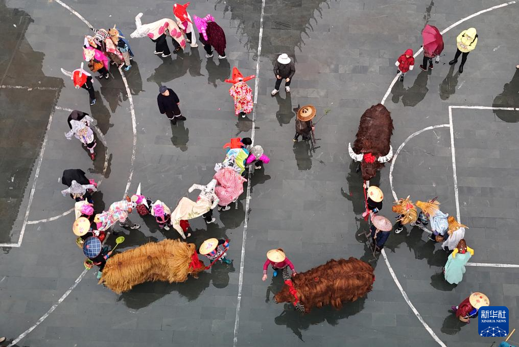 2月4日,在广西桂林市龙胜各族自治县平等镇广南村,村民在“闹春牛”(无人机照片)。