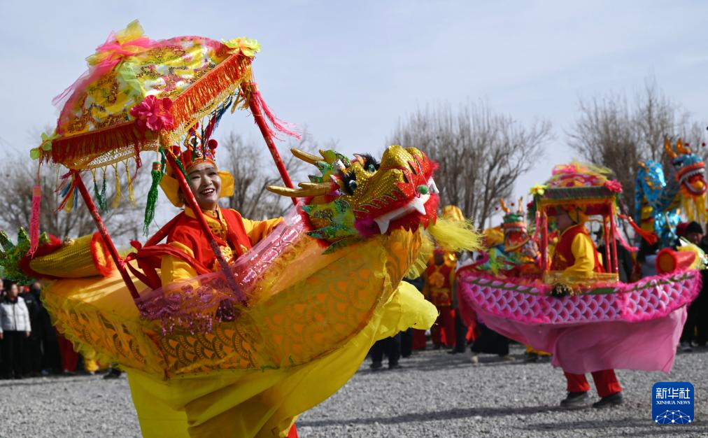 2月4日,一支社火队在甘肃省敦煌市白马塔景区表演划旱船。