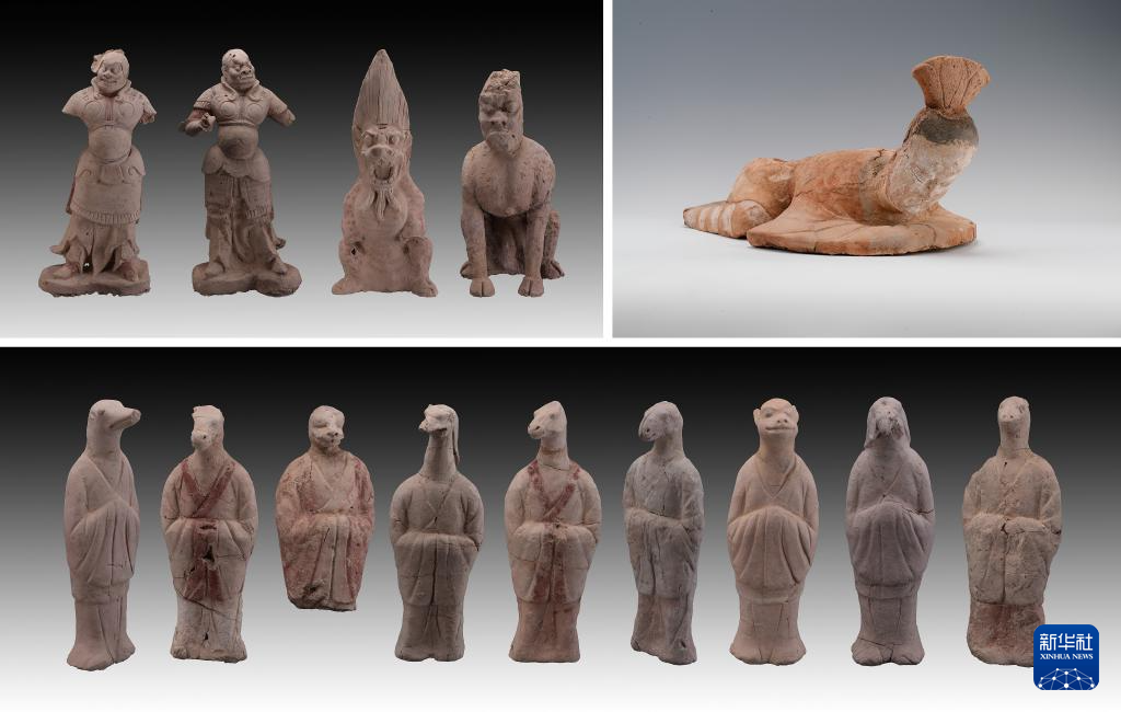 拼版照片:新疆吐鲁番市巴达木东晋唐时期墓地出土的陶俑(资料照片)。