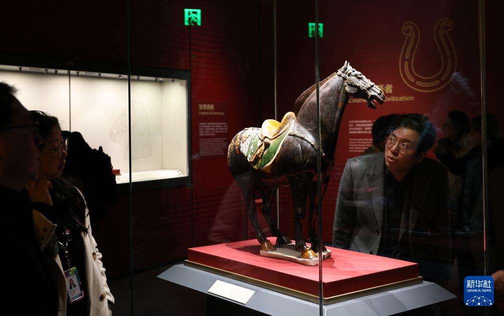 2月10日,参观者在一个三彩马展品前驻足观看。