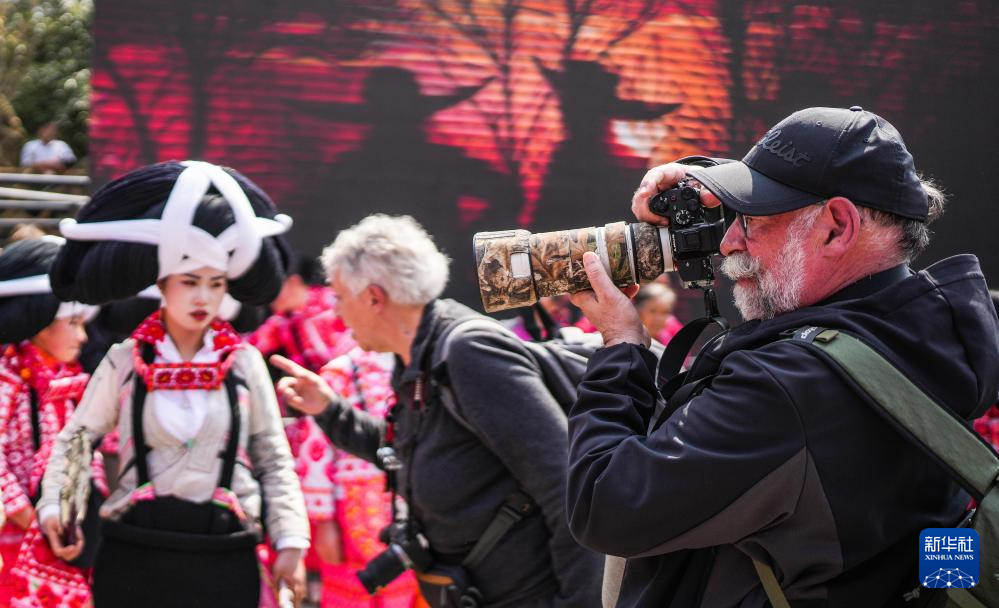 2月26日,在贵州省六盘水市六枝特区梭戛苗族彝族回族乡高兴村跳花场,国外游客在拍照。