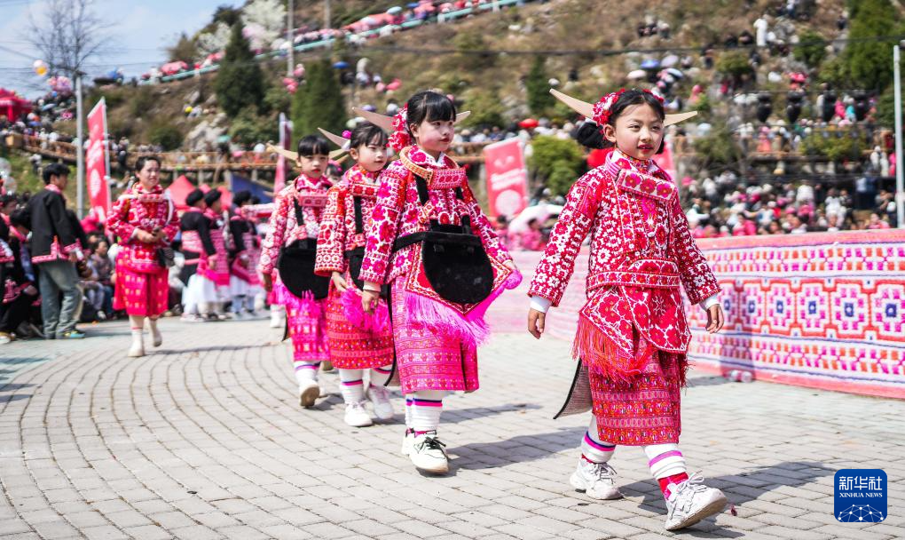 2月26日,在贵州省六盘水市六枝特区梭戛苗族彝族回族乡高兴村跳花场,小朋友们在进行巡游。