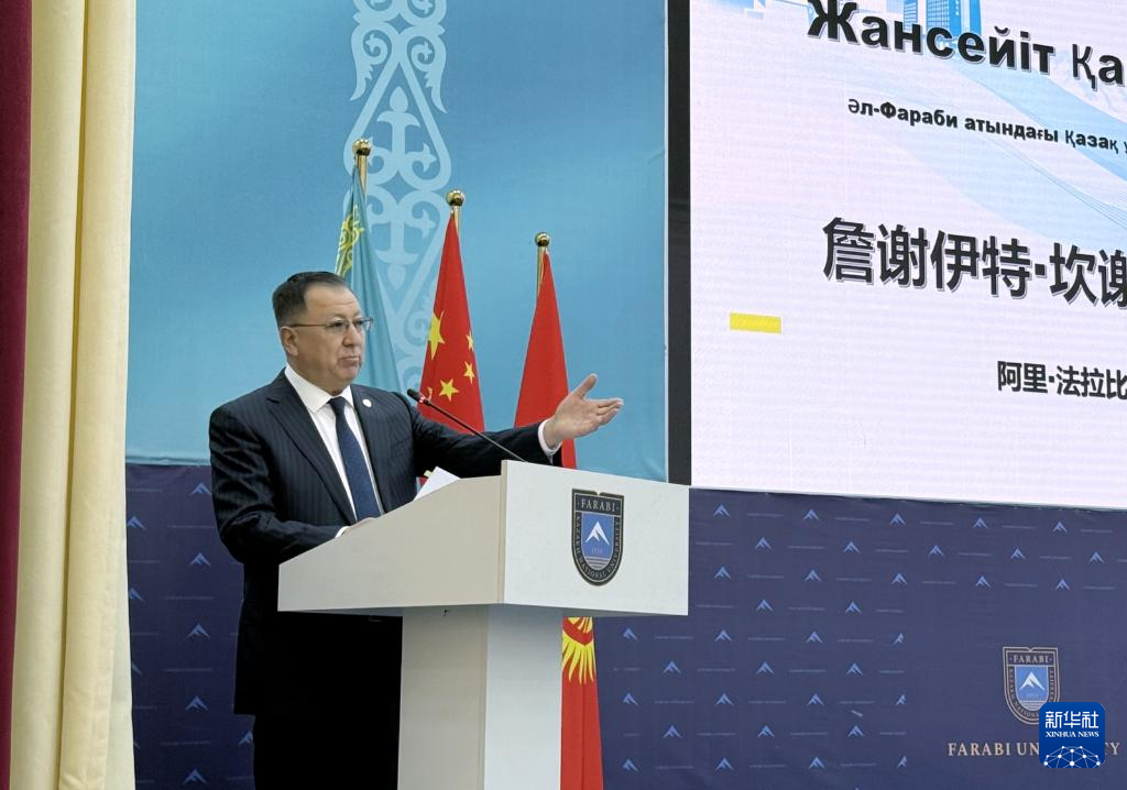 3月16日,在哈萨克斯坦阿拉木图,法拉比国立大学校长然谢伊特·图伊梅巴耶夫在揭牌仪式上讲话。