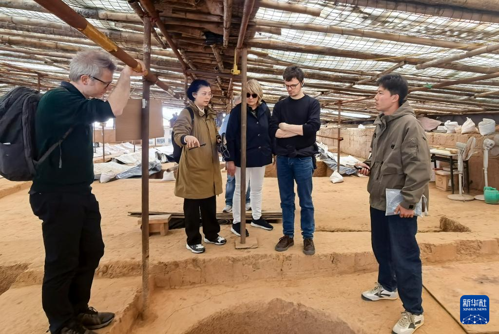 3月31日,参加中意文化遗产保护修复国际圆桌会议的意方专家在河南安阳殷墟王陵遗址考古工地参观。