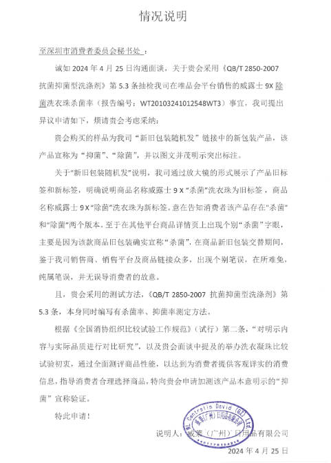 因其样品瓶身标有“Kills 99.9%”字样,且本次比较试验购买渠道唯 品 会威露士官方特卖旗舰店详情页面上也有“威露士9X杀菌洗衣珠”字眼(2024年1月26日购买)。该品牌样品同时宣称杀菌、抑菌字眼,故测试该产品杀菌率。威露士品牌方提出,深圳市消委会“购买的样品为我司‘新旧包装随机发’链接中的新包装产品……我司通过放大镜的形式……明确说明商品名称威露士9X‘杀菌’洗衣珠为旧标签,商品名称威露士9X‘除菌’洗衣珠为新标签……至于在其他平台商品详情页上出现的“杀菌”字眼……纯属笔误,并无误导消费者的故意”;为全面测评商品性能,“申请加测该产品本意明示的抑菌宣称验证”。