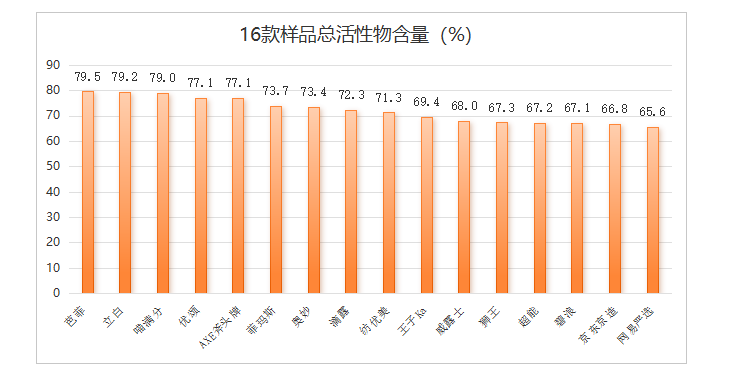 5.通常情况下,总活性物含量越高,洗涤效果越好。16款样品总活性物含量实测值在65.6%~79.5%之间。