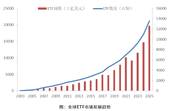 截至2025年底,全球挂牌交易的ETF达13865只,资产总规模达到19.7万亿美元,较2024年底增长31%。近20年的规模年均复合增长率超20%,产品数量更是连续20年保持正增长。