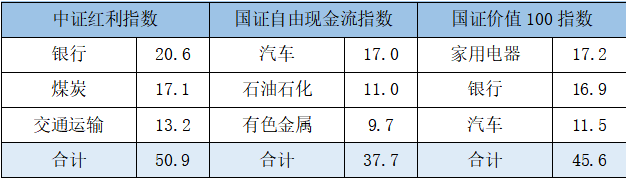 不同的选股逻辑会映射到行业上,体现为行业分布的差异。由于中证红利指数专挑那些分红多的行业,比如银行、煤炭、交通运输这些,这三大行业加起来占比超过50%,也是三个指数中行业集中度最高的;国证自由现金流指数投的净资产回报率稳定性高以及经营现金充裕的行业,汽车、石油石化、有色金属这三大行业占比接近38%;而国证价值100指数在“既要又要还要”的选股规则下,家用电器成为第一大行业,其后是银行和汽车,合计占比45.6%。