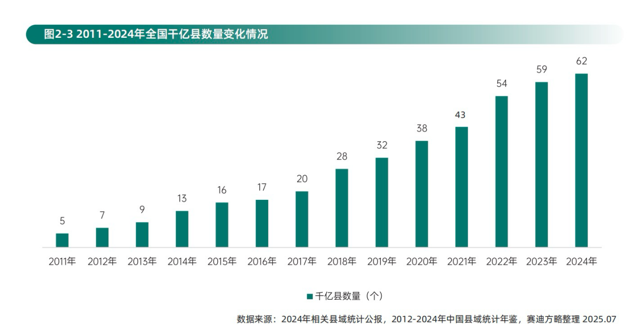 《研究》指出,2024年千亿县数量增加到62个,GDP超900亿元的准“千亿县”达到21个,800亿元以上县域数量超过100个,700亿元以上县域接近150个,未来准千亿县数量将持续增加,竞争持续加剧。
