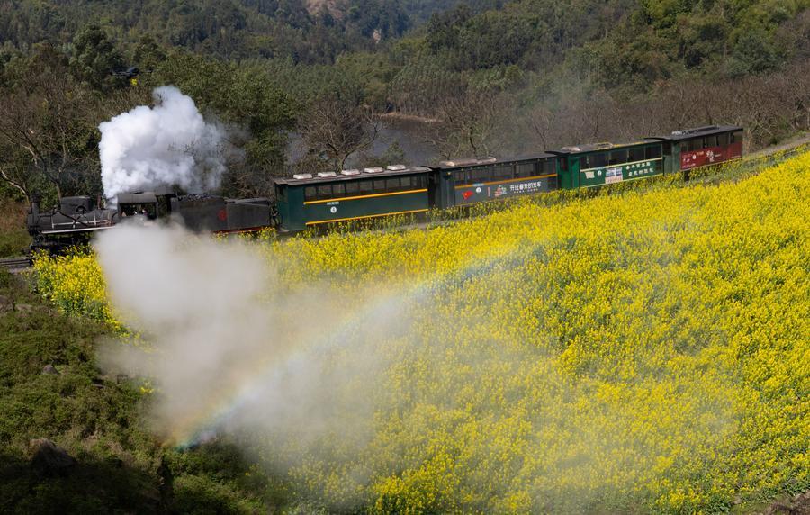 各地努力把美丽生态“颜值”转化为经济“产值”。在乐山市犍为县,“开往春天的小火车”吐着白色蒸汽穿行油菜花海,载着游人缓缓行驶;绵阳市北川羌族自治县永昌镇高安村推出“马上赏花”沉浸式新玩法,开园首日吸引游客超万人次。
