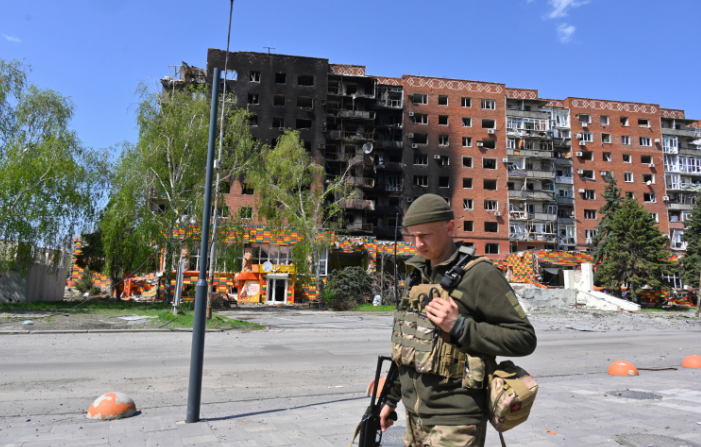 4月23日,一名乌军士兵走过波克罗夫斯克市中心一栋被毁坏的建筑。(美联社资料图片)