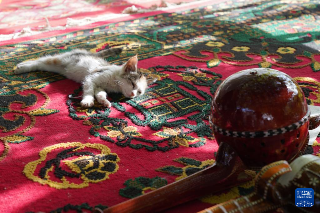 在位于加依村的家中,努尔东·司马义养的小猫在乐器旁休憩(10月15日摄)。