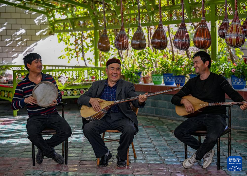 加依村乐器制作历史悠久,被誉为“新疆民间手工乐器制作第一村”。走在加依村,随处可见与乐器有关的壁画和装饰物。村内设有乐器展示中心,迎接各地宾朋。村民在农忙之余,约三五好友相聚,合奏一曲,或慷慨激越,或婉转低回,大家翩跹起舞,脸上洋溢着幸福的微笑。