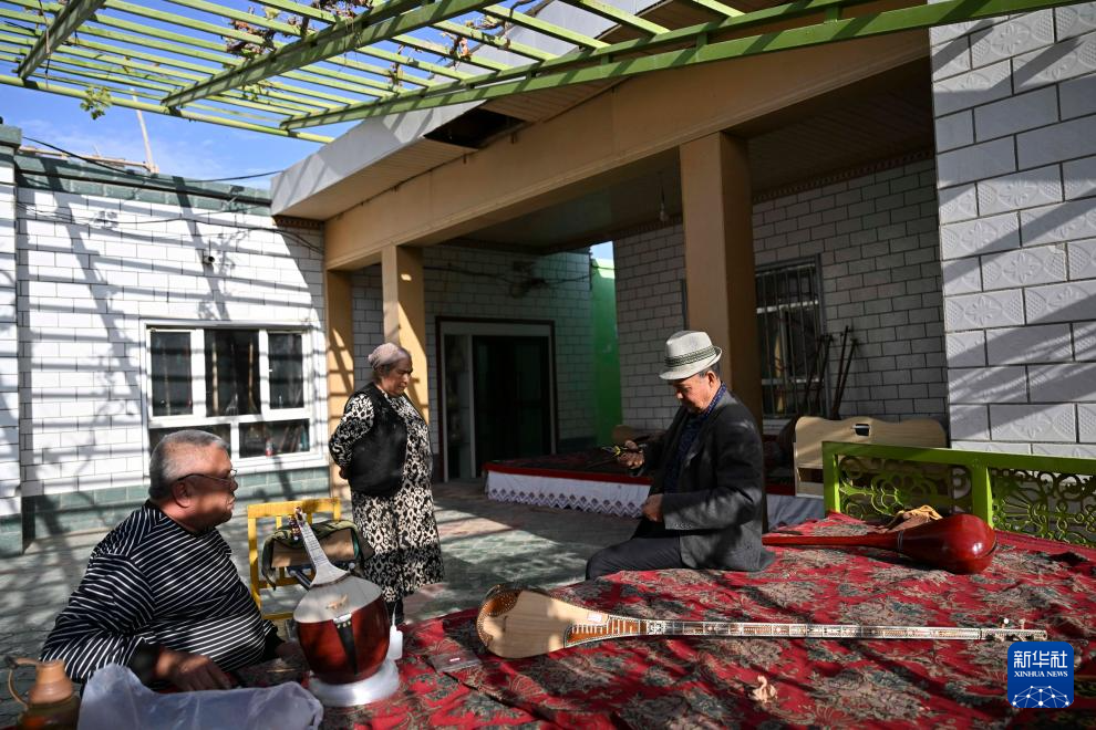 努尔东·司马义(左二)和村民在院子里演奏(10月30日摄)。