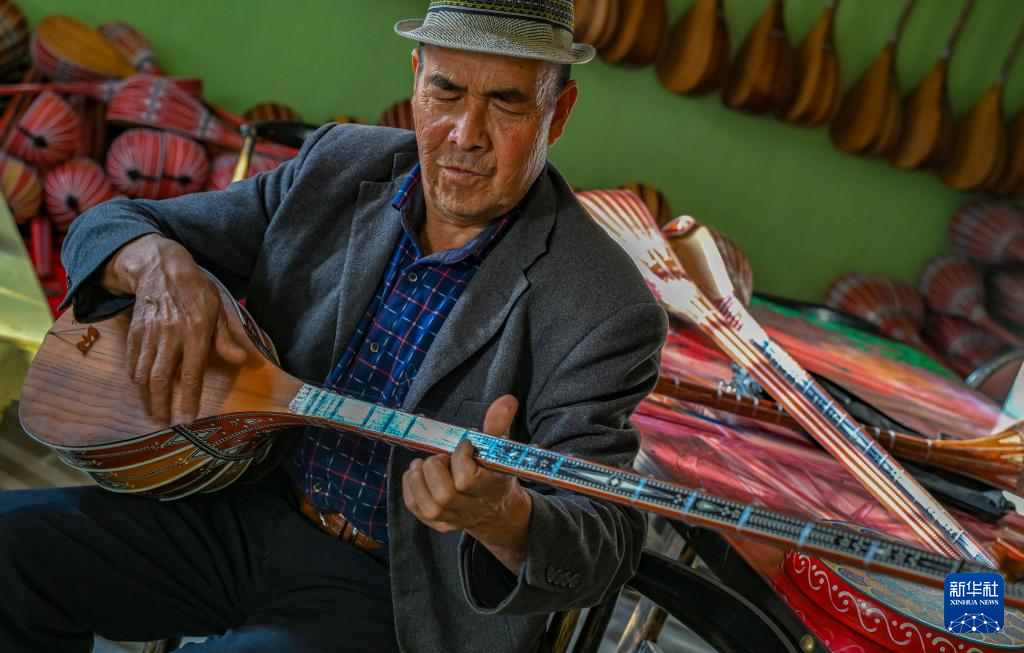 努尔东·司马义在家中用自己手工制作的都塔尔弹奏喜欢的乐曲(10月29日摄)。