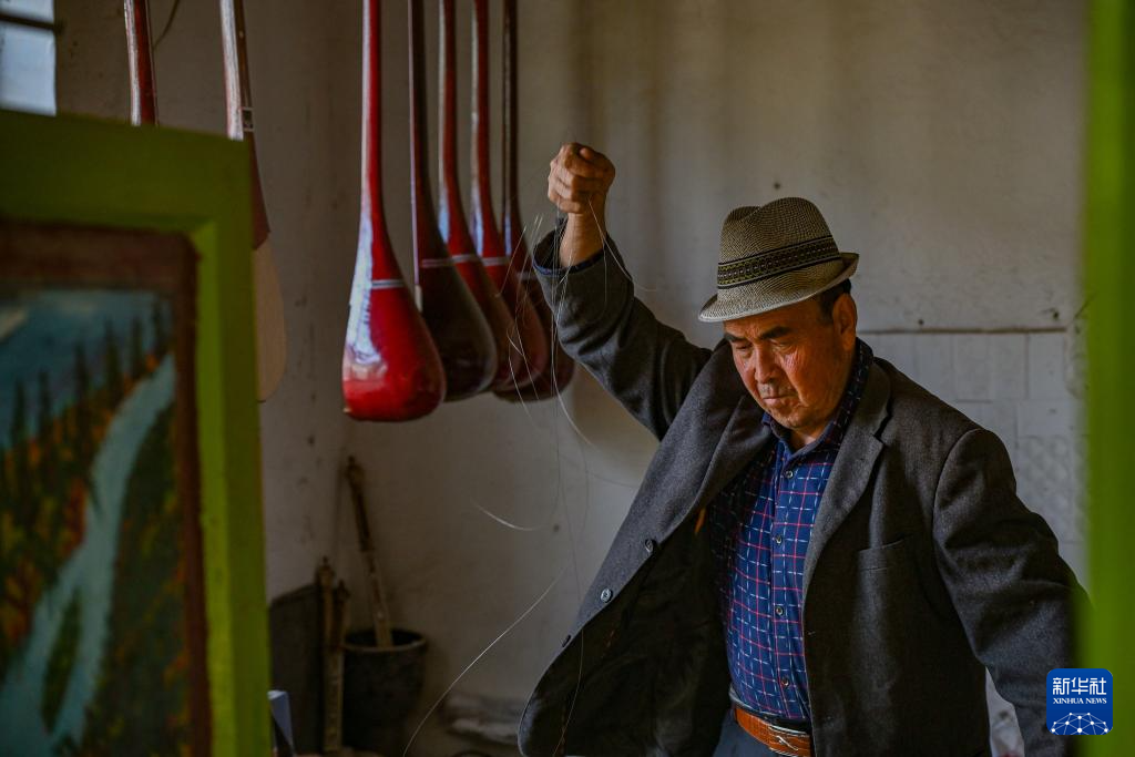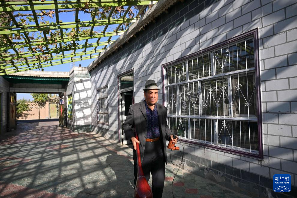 努尔东·司马义拿着琴弦走出房间(10月30日摄)。
