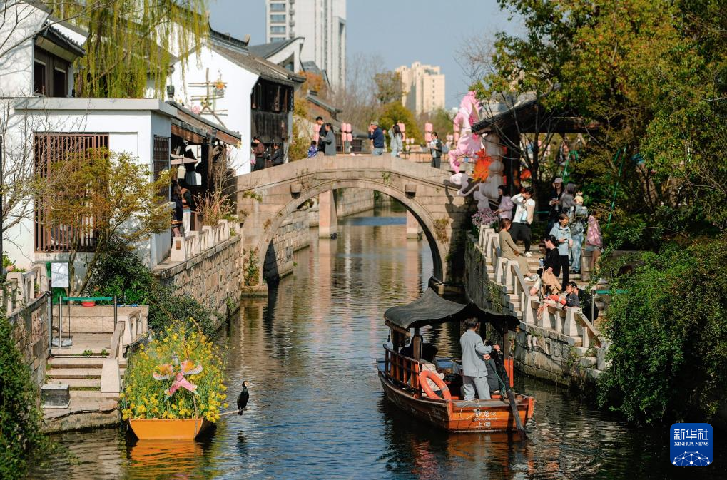 3月28日,在青浦区蟠龙新天地,市民游客在赏景游玩。