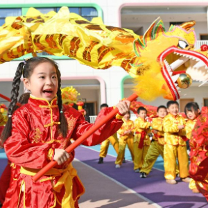 浙江省台州市仙居县迎晖幼儿园的小朋友在表演舞龙,喜迎龙年新春(2024年1月18日摄)。新华社发(王华斌摄)
