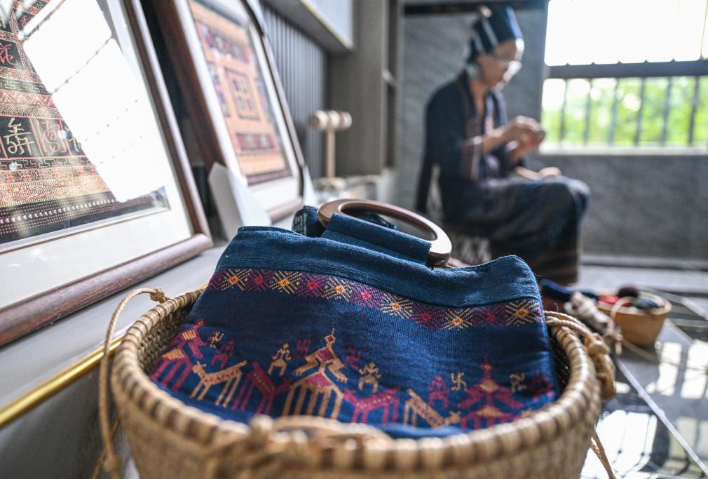这是在海南省东方市东河镇拍摄的黎族传统纺染织绣技艺省级传承人符永英用黎锦制作的手袋(2023年6月7日摄)。新华社记者 蒲晓旭 摄