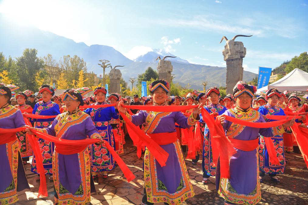 在四川省阿坝藏族羌族自治州茂县中国古羌城,当地羌族群众载歌载舞庆祝羌年(2024年11月1日摄)。新华社发(何清海摄)