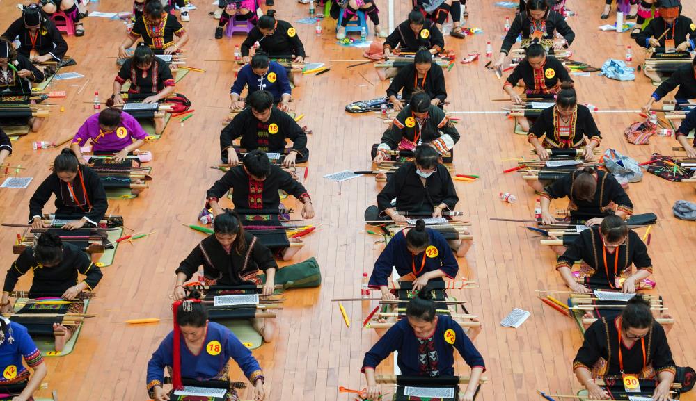 在海南省乐东黎族自治县,选手们在技艺比赛现场编织黎锦(2023年4月23日摄)。新华社记者 樊雨晴 摄