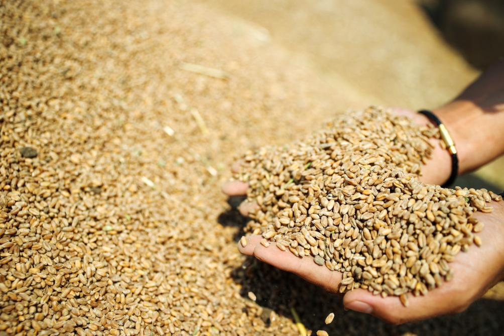 5月26日,农民在浙江省湖州市吴兴区东林镇保国村查看收获的小麦。新华社发(何伟卫摄)