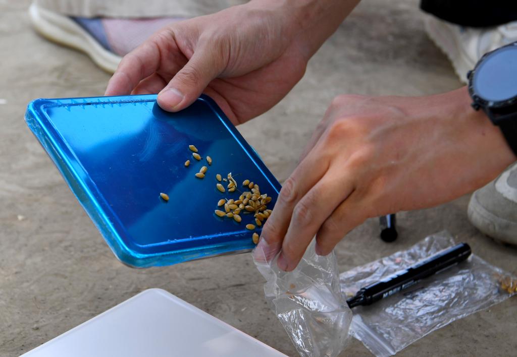 5月28日,在河南省周口市商水县举行的小麦机收减损技能大比武活动现场,工作人员在选定的采样区域捡拾掉落的麦粒。新华社记者 郝源 摄