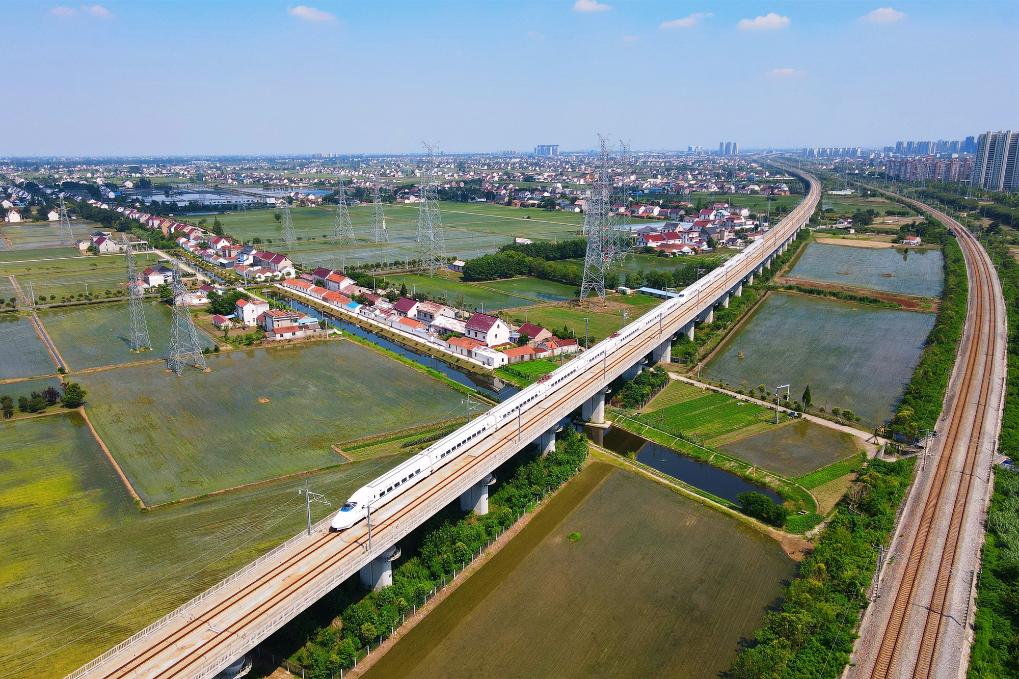 7月1日,列车行驶在江苏省如皋市境内(无人机照片)。 新华社发(吴树建摄)