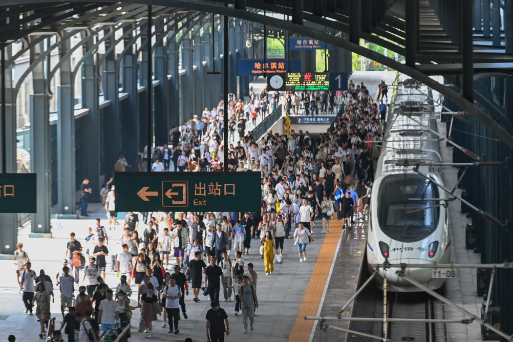 8月2日,旅客在哈尔滨火车站有序出站。新华社发(原勇摄)